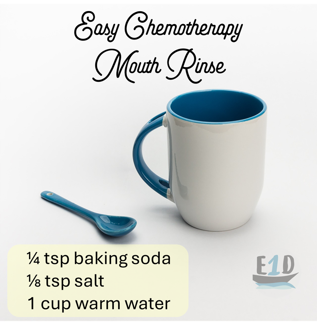 A mug with teaspoon and recipe for an Easy Chermotherapy Mouth Rinse