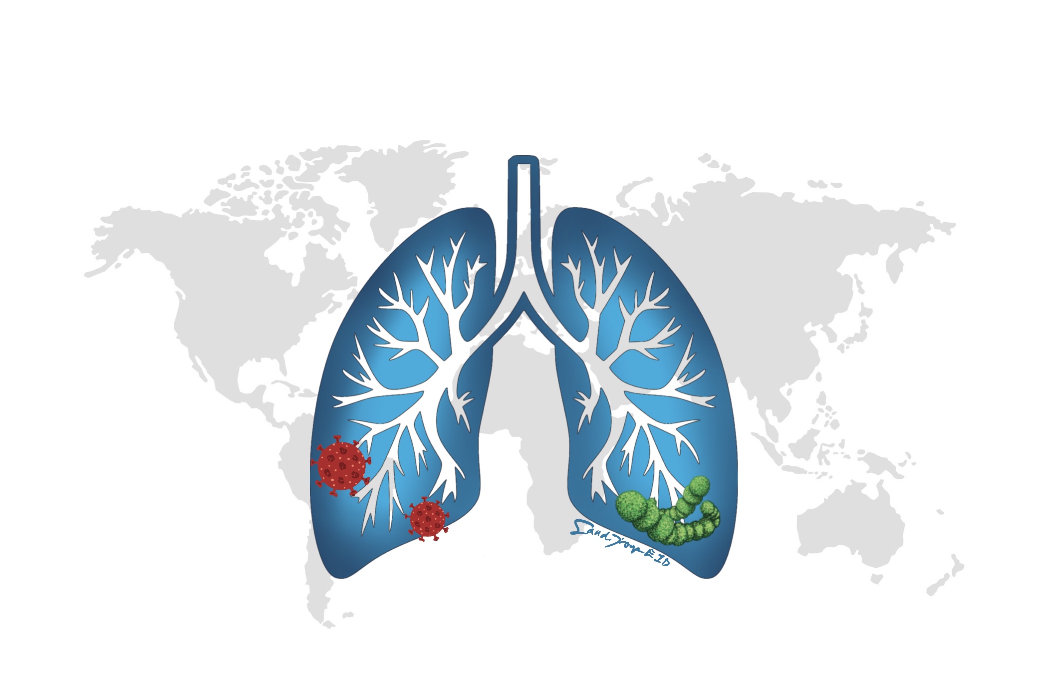 A lung against a backdrop of the globe. The base of the lung has representative microbes that cause pneumonia, such as viruses and pneumococcus. Learn all about pneumonia in this episode.