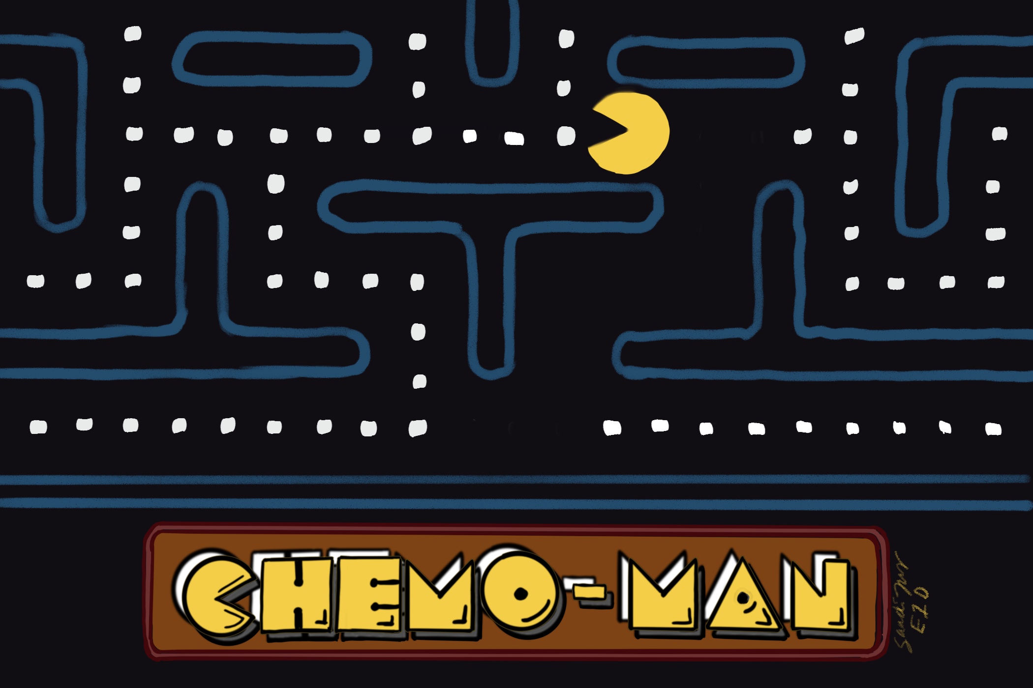 A Pac-Man game-like image with the label "Chemo-Man". Many chemotherapy patients like to imagine a Pac-Man gobbling up cancer cells as they get chemotherapy treatment. Learn more in S6E05 episode on Chemotherapy. https://every1dies.org